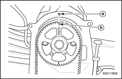 1. После завершения проверки клапанного зазора в верхней мертвой точке компрессии цилиндра № 1 расположить цилиндр № 1 в верхней мертвой точке выпуска, повернув коленчатый вал по дуге на 360 градусов. (При совмещении точки (h) на звездочке распределительного вала с треугольным указателем (е) на задней крышке приводного ремня газораспределительного механизма мертвая точка выпуска располагается в последовательности зажигания для цилиндра № 1.)