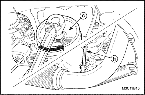1. Отвернуть винт и снять шкив приводного ремня газораспределительного механизма (с). Для откручивания винта использовать отвертку (h) согласно рисунку.