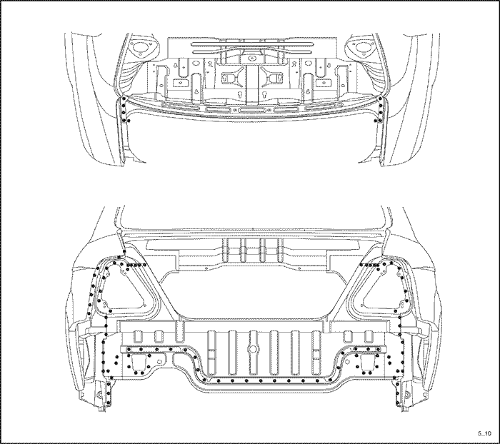 - Накерните точки вокруг точек сварки на наружной стороне задней панели и продолжении панели заднего пола кузова.