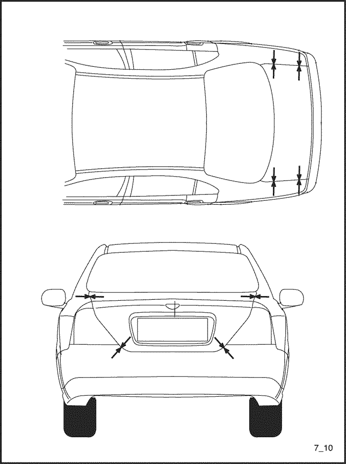 - Закройте крышку багажника и проверьте зазоры и разницу уровней крышки багажника, наружных панелей боковин и задних комбинированных фонарей.