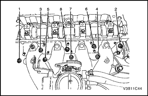 15. Снимите стопорные винты и стопорные гайки впускного коллектора в указанной последовательности.