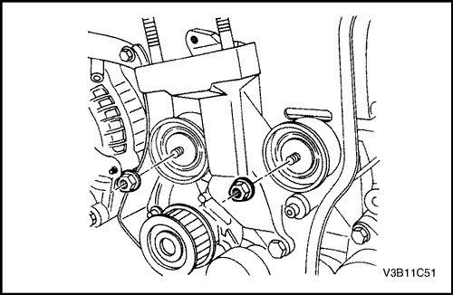Затяните гайки холостого шкива приводного ремня газораспределительного механизма дло 25 Н•м (18 фунто-футов).