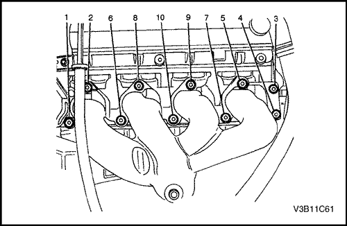 5. Снимите стопорные гайки выпускного коллектора в указанной последовательности.