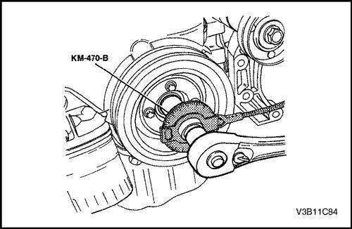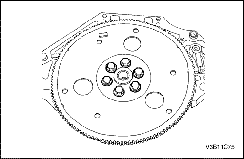 Затяните винты маховика до 65 Н•м (48 lb-ft). Используя угловой индикатор крутящего момента KM-470-B, затяните винты маховика еще на 30 градусов плюс 15 градусов. Для автоматической коробки передач с главной передачей в сборе затяните винты гибкой пластины до 60 Н•м (44 фунто-фута).