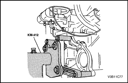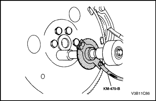 Затяните болт ведущей шестерни приводного ремня газораспределительного механизма коленчатого вала до 135 Н•м (100 фунто-футов) плюс от 30 до 10 градусов, используя угловой индикатор крутящего момента KM-470-B.