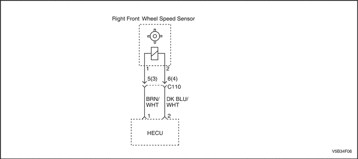 Подключить омметр к контакту 6 жгута проводов hecu, а затем к контакту 1 датчика скорости колеса.