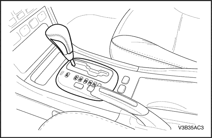 Нажать педаль тормоза и перевести рычаг переключения передач по всем положениям, на несколько секунд удерживая в каждом положении. Переместить рычаг переключения передач в положение "Парковка". (Показано левостороннее рулевое управление, правостороннее аналогично.)