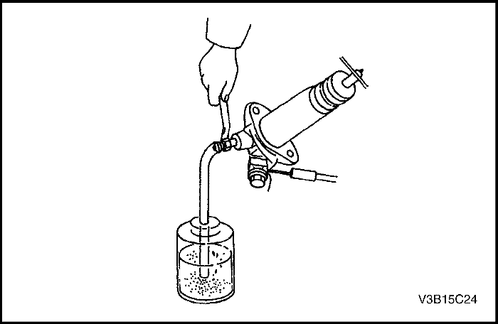 3. При нажатии на педаль сцепления медленно открутить штуцер, чтобы жидкость начала выливаться по трубке. Закрутить штуцер.