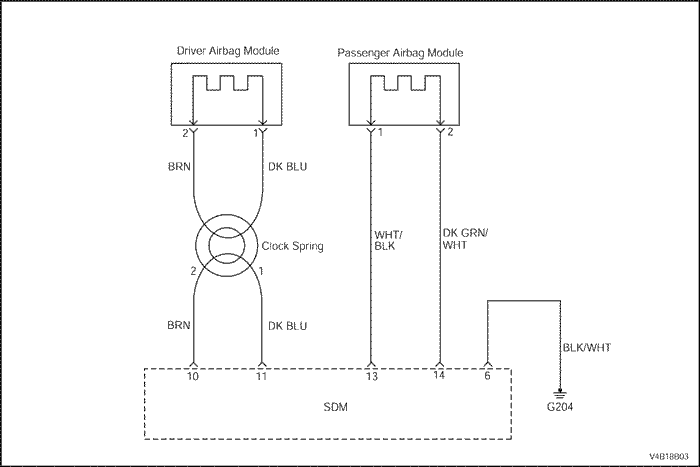 Модуль датчиков и диагностики (SDM) проверяет проводку к модулю подушки безопасности водителя, пропуская ничтожно малый ток через внутреннюю цепь и проверяя сопротивление.