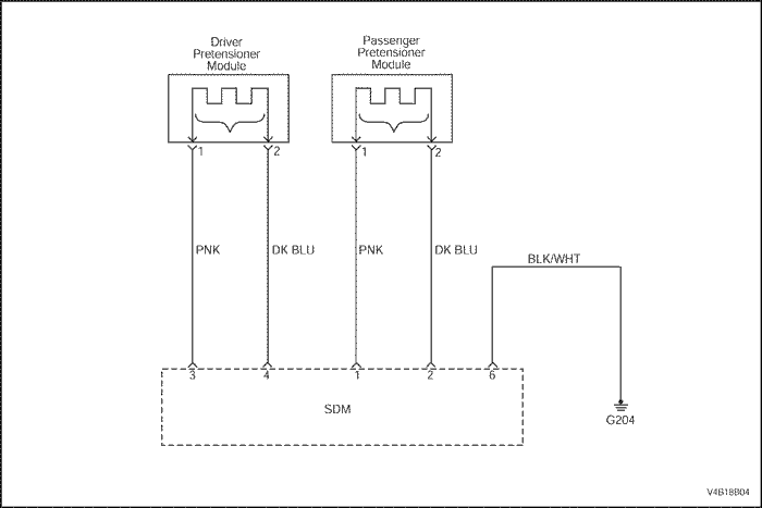 Модуль датчиков и диагностики (SDM) проверяет проводку к преднатяжителю ремня безопасности водителя, пропуская ничтожно малый ток через внутреннюю цепь и проверяя сопротивление.