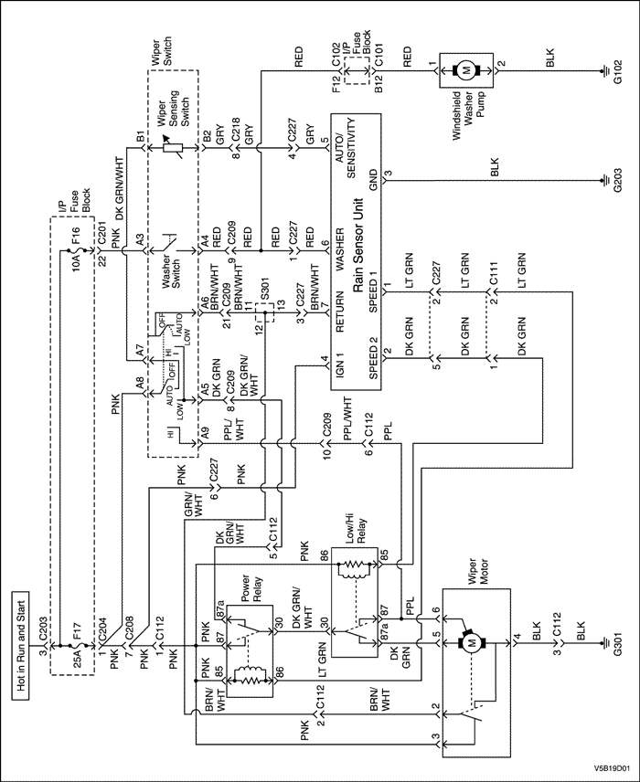 Реле мощности и реле низкой/высокой скорости управляются блоком датчика дождя и контролируют работу стеклоочистителей.