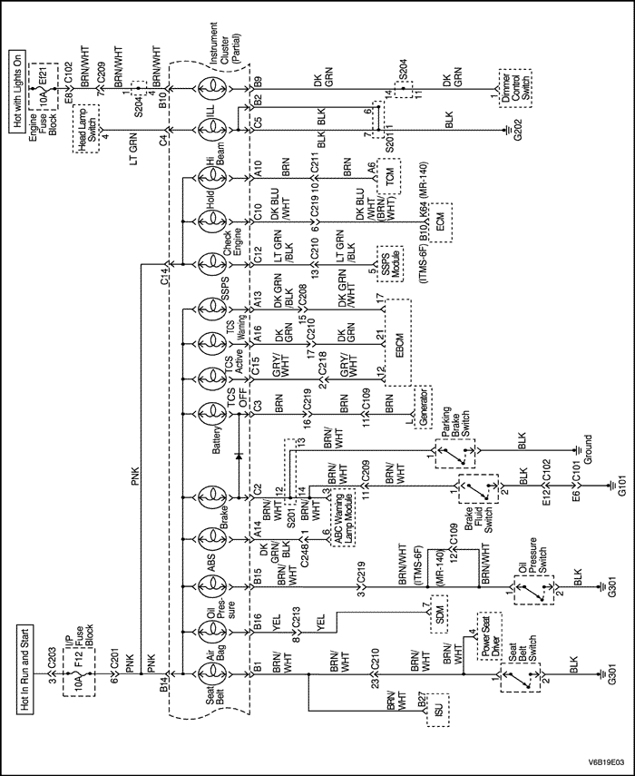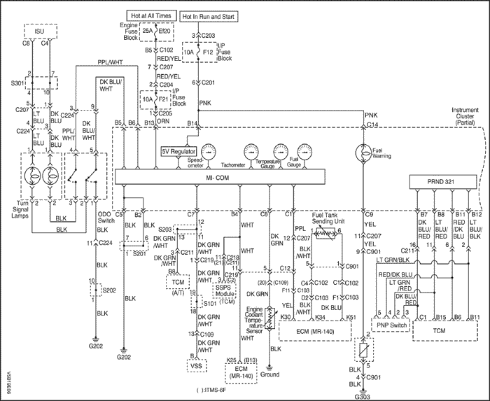 С помощью омметра проверить сопротивление между выводом К30 разъёма ecm и выводом c1 разъёма комбинации приборов.