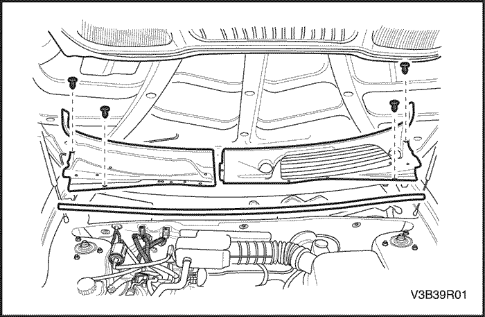 Затянуть винты вентиляционной решетки в облицовке рамы ветрового стекла с усилием 3 Н•м (27 фунт-дюйм).