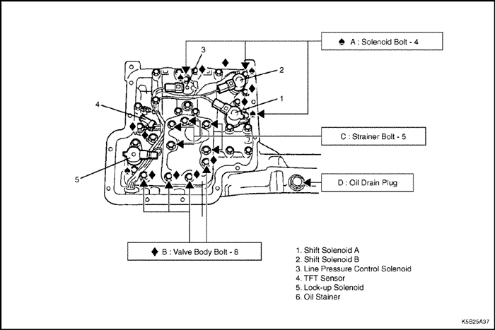 ♠ A: Болт электромагнитного клапана переключения передач - 8 Н • м (71 фунт на дюйм)