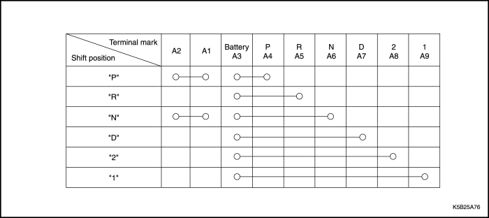 Проверить переключатель диапазонов коробки передач, соответствует ли электропроводность в каждой позиции следующей таблице.