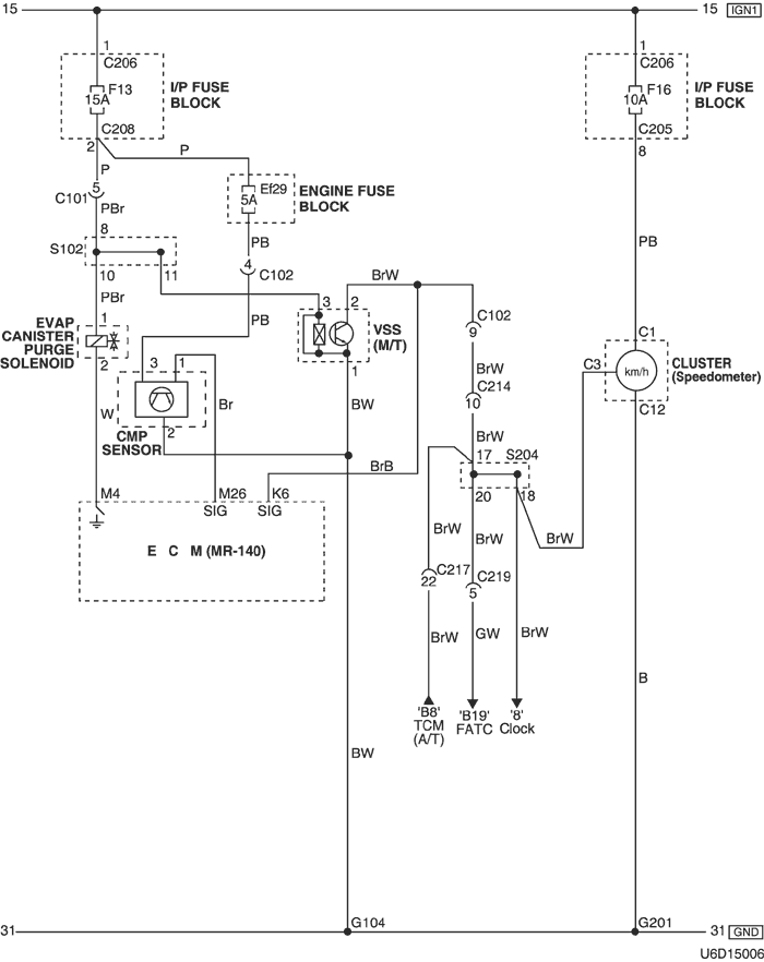 6) ЦЕПЬ КЛАПАНА ПРОДУВКИ АДСОРБЕРА СИСТЕМЫ УЛАВЛИВАНИЯ ПАРОВ БЕНЗИНА, ДАТЧИКА СКОРОСТИ АВТОМОБИЛЯ И ДАТЧИКА ПОЛОЖЕНИЯ РАСПРЕДЕЛИТЕЛЬНОГО ВАЛА
