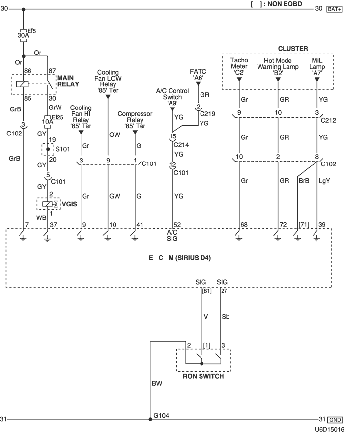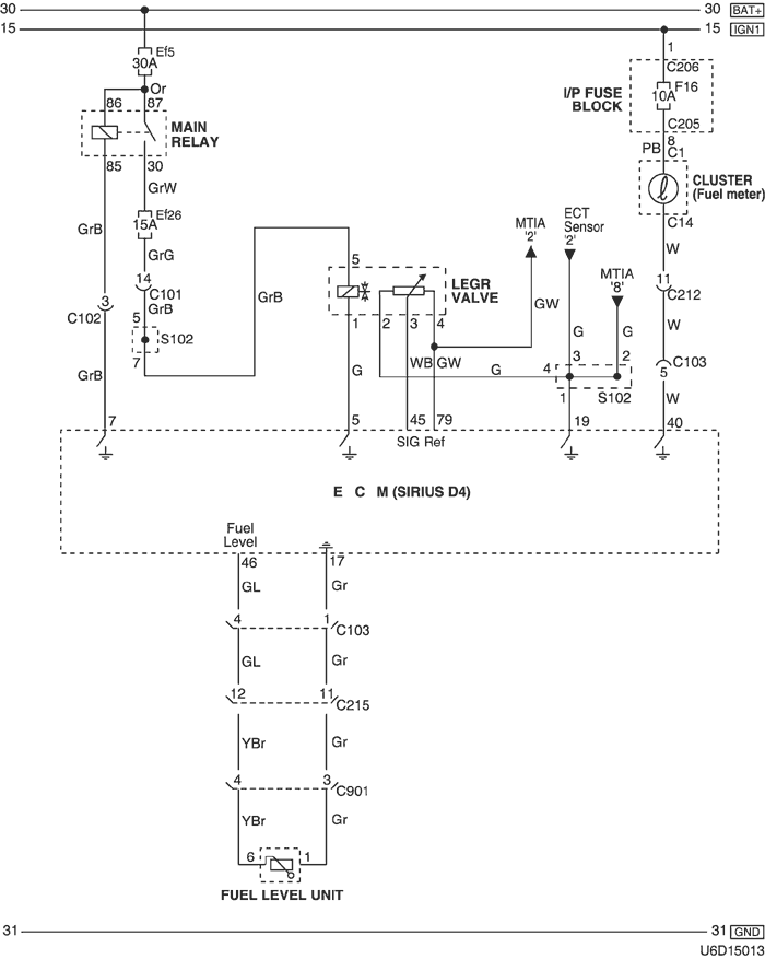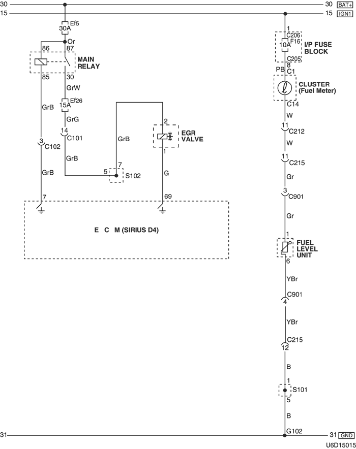 7) ЦЕПЬ КЛАПАНА РЕЦИРКУЛЯЦИИ ОТРАБОТАВШИХ ГАЗОВ И УКАЗАТЕЛЯ УРОВНЯ ТОПЛИВА : БЕЗ БОРТОВОЙ СИСТЕМЫ ДИАГНОСТИКИ