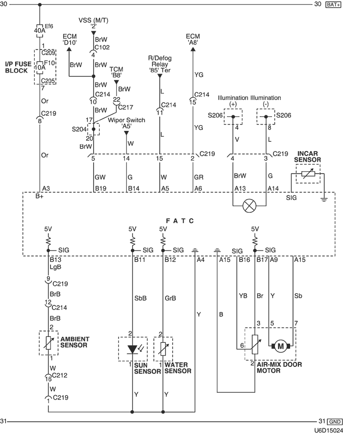 3) ЦЕПЬ ЭЛЕКТРОПРИВОДА ВОЗДУШНОЙ СМЕСИТЕЛЬНОЙ ЗАСЛОНКИ, КОМПР. КОНДИЦИОНЕРА И ДАТЧИКОВ (ТЕМПЕРАТУРЫ НАРУЖНОГО ВОЗДУХА, СОЛНЕЧНОГО ОСВЕЩЕНИЯ, ВЛАГИ, САЛОНА) : ITMS - 6F