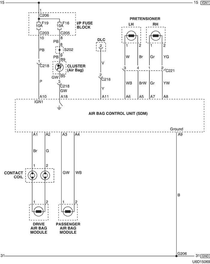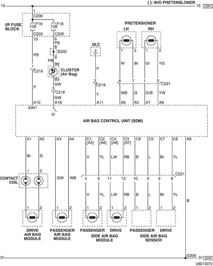 1) air bag control unit (sdm) & air bag warning lamp circuit: w/o side air bag