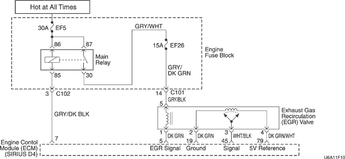 | 8 | Проверить контрольную цепь сигнала напряжением 5 В датчика положения клапана egr на наличие одного из следующих условий: - Обрыв.