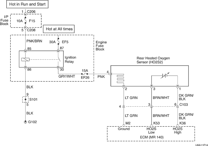 - Определяет, имеется ли напряжение на датчике ho2s2 из-за обрыва цепи предохранителя датчика ho2s2 или цепи зажигания. Если предохранитель перегорел, перед его заменой определить, не является ли причиной перегорания короткое замыкание в цепи зажигания.