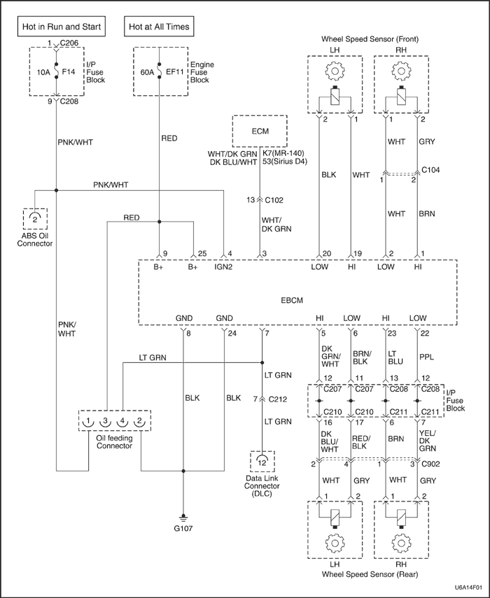 При обнаружении какой-либо неисправности в системе АБС, HECU включает контрольную лампу АБС, сообщая водителю о необходимости выполнения проверки АБС.