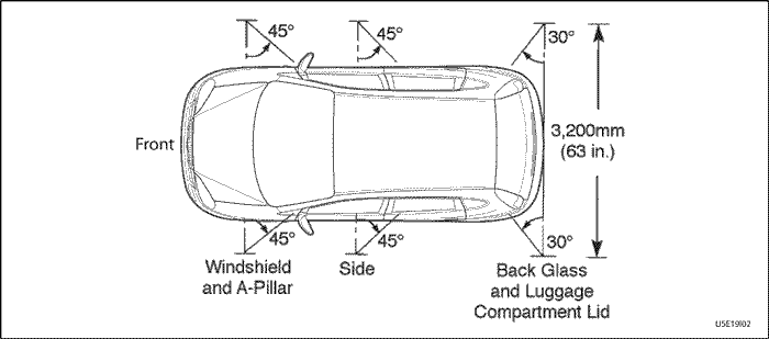 Примерно 30° вниз, 30° вперед и направлен примерно на 610 мм (24,0 дюйма) от угла заднего стекла