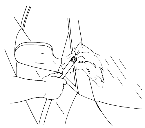 14. Сразу после нанесения клея, с помощью плоской палочки или аналогичного инструмента обеспечить проникновение клея в зону протекания и в соединения между оригинальным материалом и корпусом автомобиля для обеспечения герметичности.