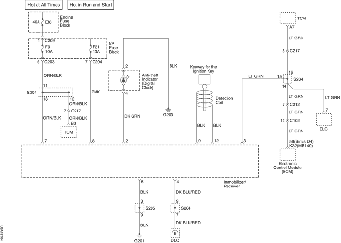 Когда зажигание включено, диагностический прибор может переключить блок управления иммобилизирующей системы в режим DLC для диагностики, кодировки ключа и кодировки идентификационного номера.