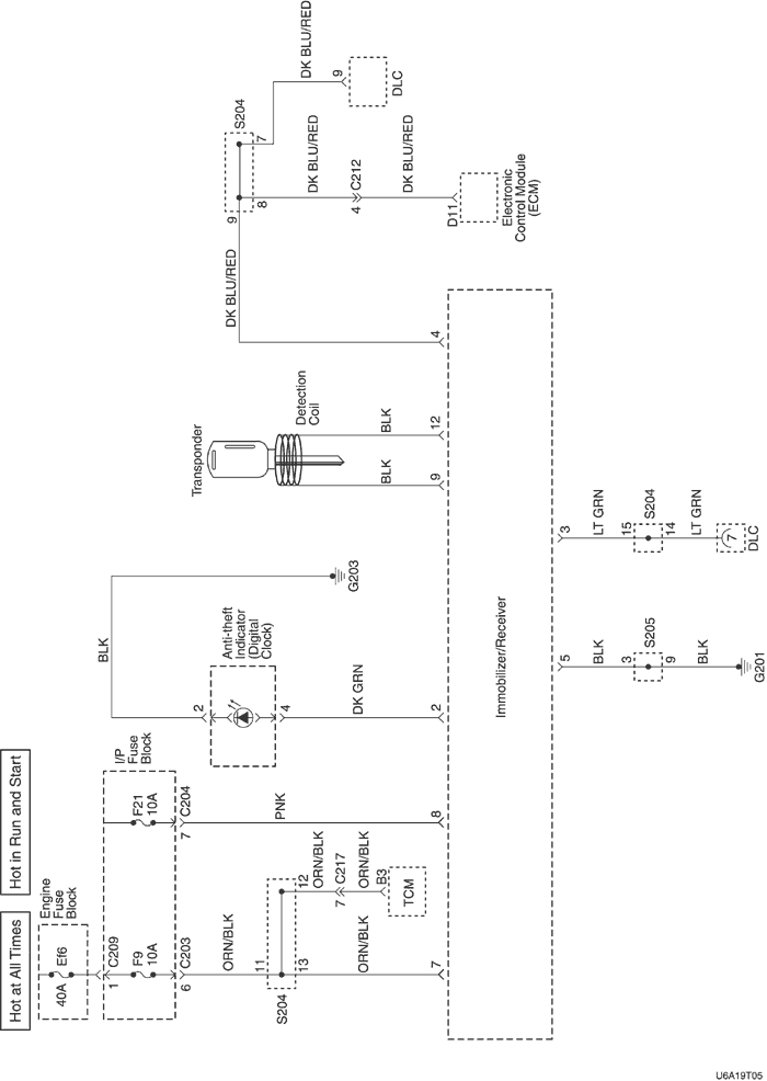 При использовании действующего ключа происходит передача сообщения с ЕСМ, а дисплей изображает состояние иммобилизирующей системы. В случае использования недействительного ключа ЕСМ выключает цепь топливного инжектора с помощью закодированного внедрения и устанавливает диагностический код неисправности (DTC)