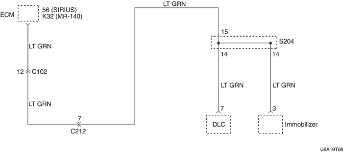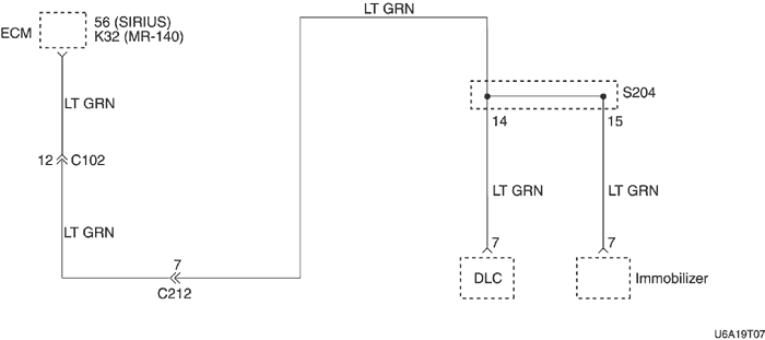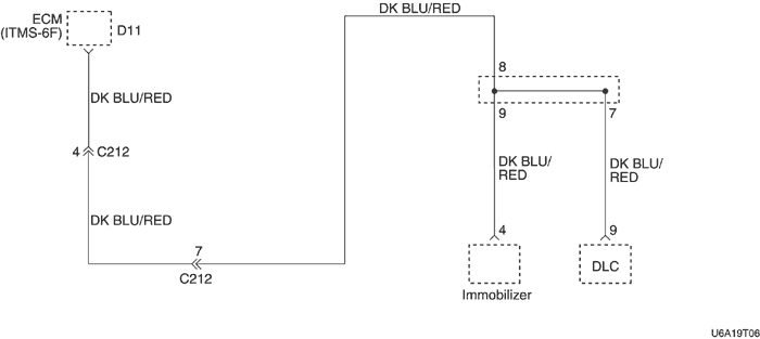 3. Если связь оказалась неудачной и при второй попытке, то выключить зажигание и проверить провод и коннекторы между клеммой 7 блока управления иммобилизирующей системы и клеммой 7 разъема линии передачи данных (dlc).