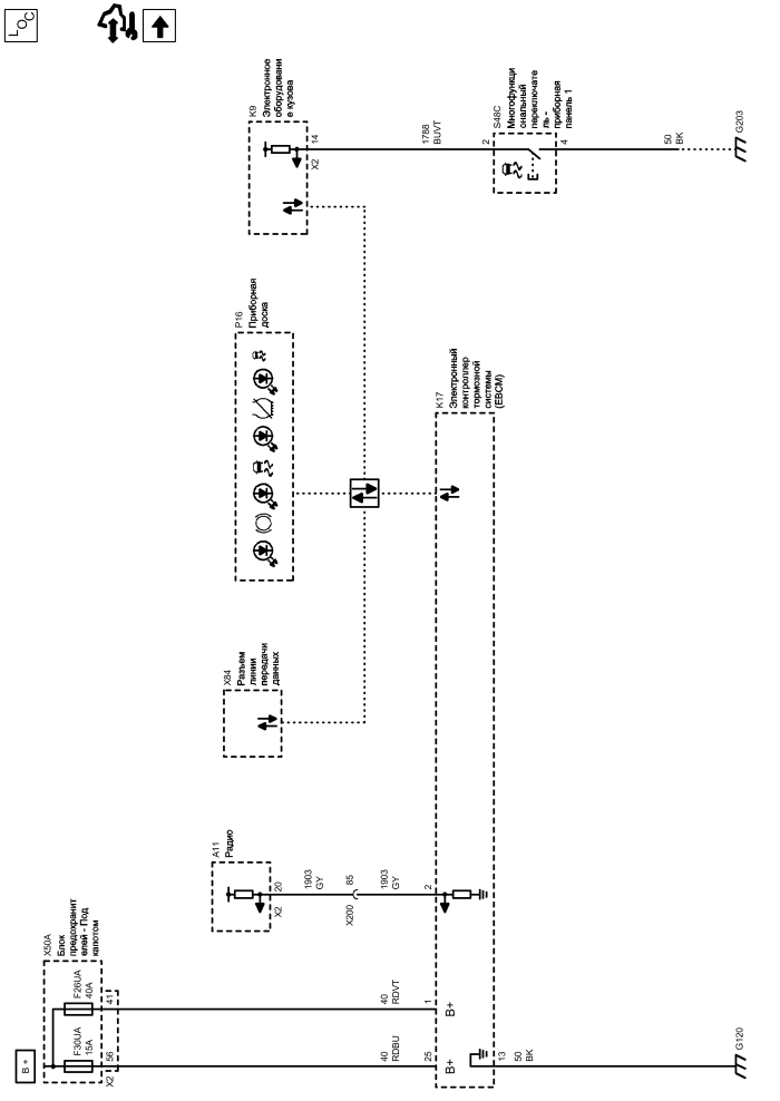 | g120 | Моторный отсек - Передняя часть, слева | g203 | Поперечина, панель приборов - позади аудиосистемы |
