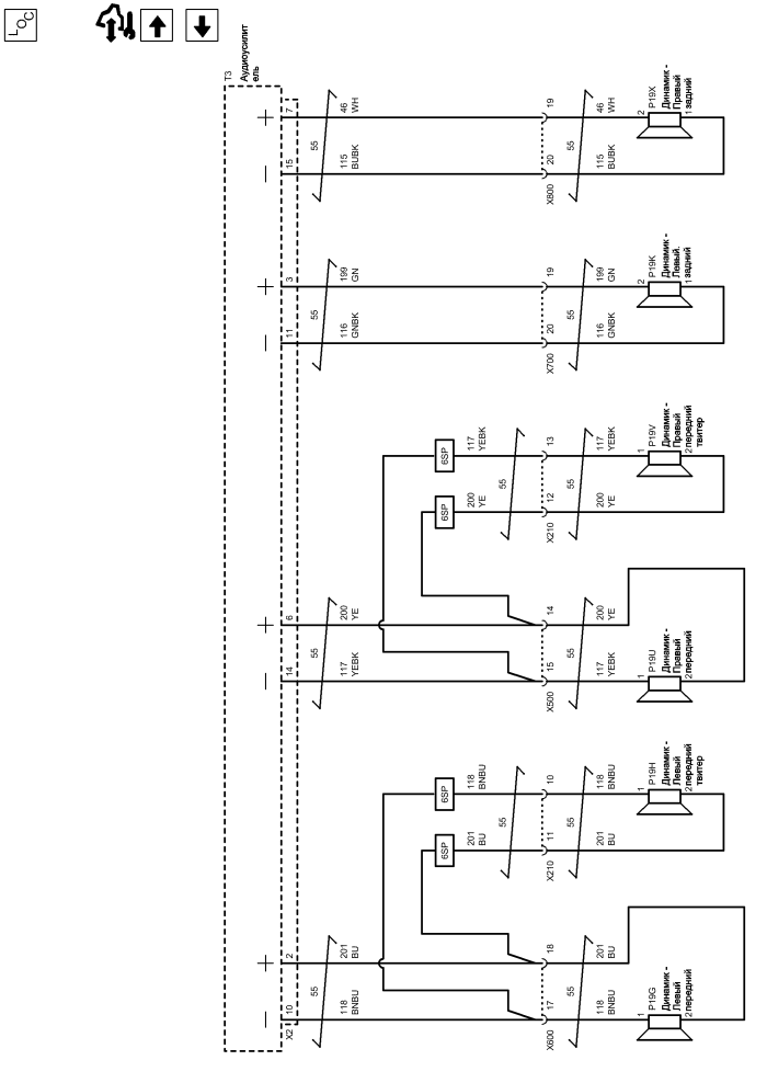 | t3 (x2) | Аудиоусилитель x2 | x600 | Жгут проводов кузова и жгут проводов двери пассажира |