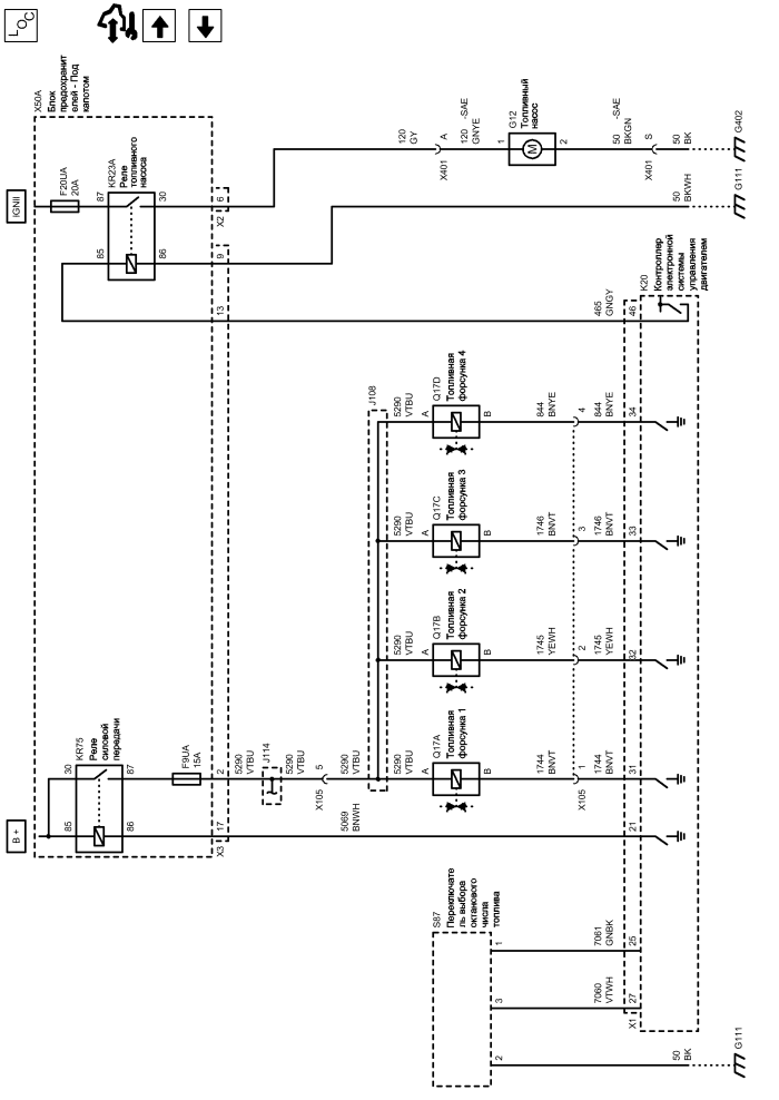 | k20 (x1) | Контроллер электронной системы управления двигателем x1 | x401 | Жгут проводов кузова и жгут проводов топливного бака |