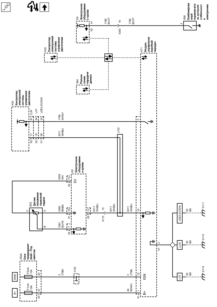 | j120 | Жгут проводов двигателя | k20 (x2) | Контроллер электронной системы управления двигателем x2 |