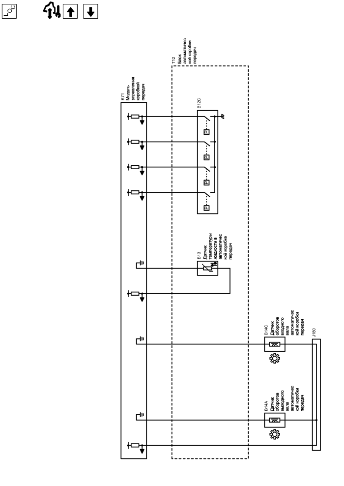 | b14a | Датчик оборотов выходного вала автоматической коробки передач | t12 | Блок автоматической коробки передач |