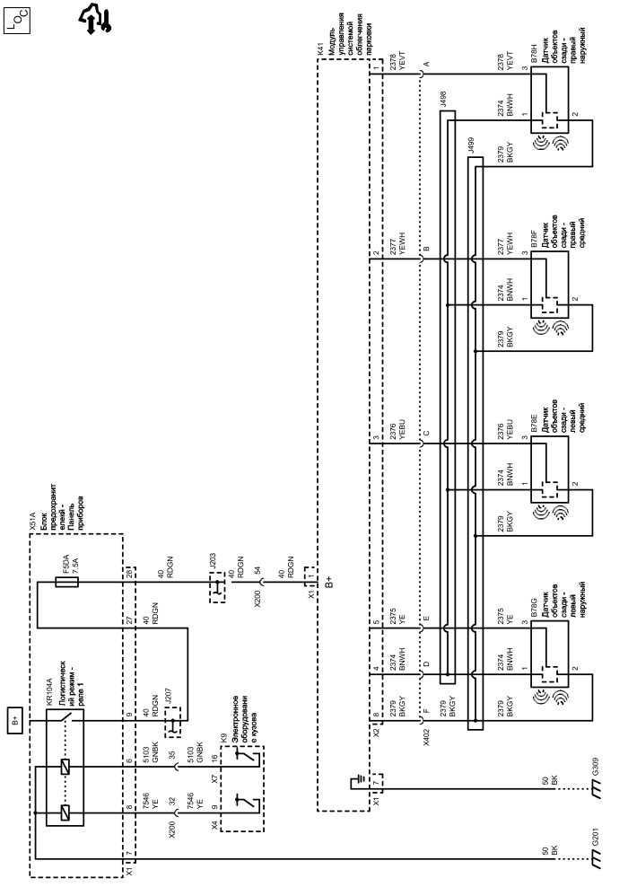 | b78h | Датчик объектов сзади - правый наружный | x51a | Блок предохранителекй - Панель приборов |