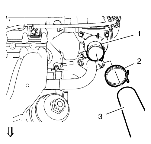| 5. | Снять впускной шланг (3) радиатора с термостата (1) охлаждающей жидкости двигателя. |