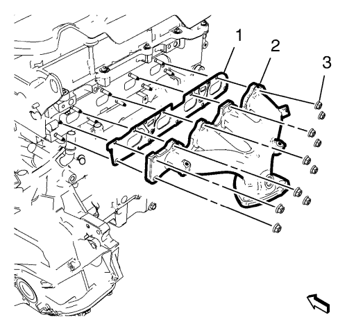 | 2. | Завернуть 10 гаек (3) крепления выпускного коллектора и затянуть их с моментом затяжки 14 n·m (124 фунт-дюймов). |