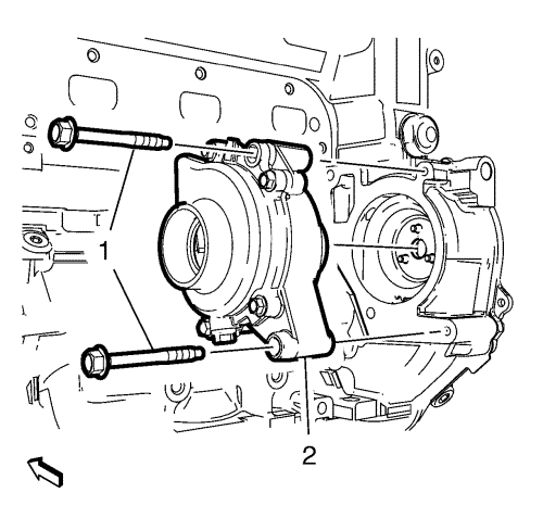 | 1. | Установить насос охлаждающей жидкости (2) и 2 болта насоса охлаждающей жидкости (1) и затянуть с моментом затяжки 23 n·m (17 фунт-футов). |