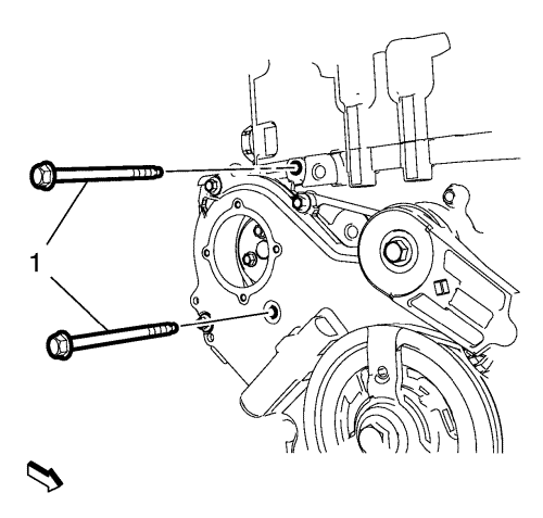| 6. | Полностью открутить 2 болта (1) насоса охлаждающей жидкости из передней крышки двигателя. |