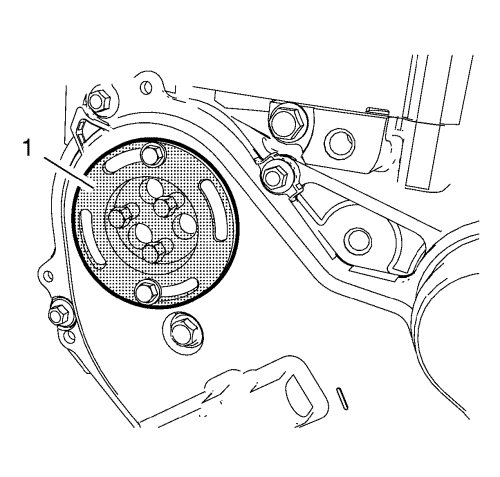 | 4. | Снять стопорный инструмент en-44602 (1) со звездочки насоса охлаждающей жидкости. |