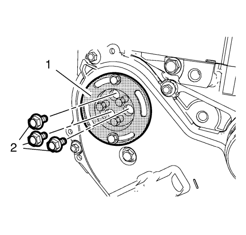 | 3. | Установить 3 болта звездочки насоса охлаждающей жидкости (2) с помощью стопорного инструмента en-44602 (1) и затянуть болты с моментом затяжки 8 n·m (71 фунт-дюйм). |