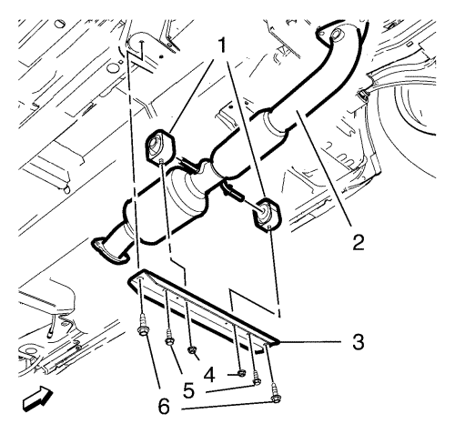 | 12. | Снять 2 подвесных кронштейна (3) каталитического нейтрализатора вместе с каталитическим нейтрализатором (2). |
