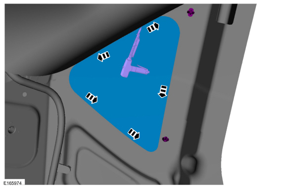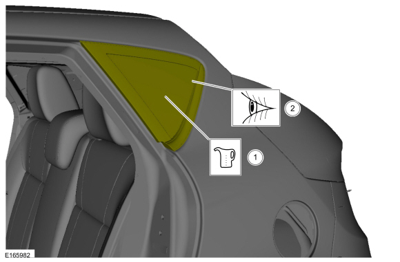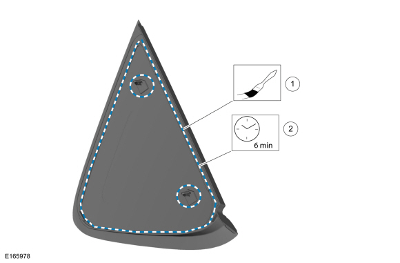 Apply urethane adhesive to the outside edges of locating pins on the rear quarter window glass.NOTE: Position the rear quarter window glass within 10 minutes of applying the urethane adhesive.