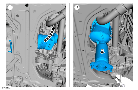 1.Position the catalytic converter on the 2 bolts and install the upper bolt.