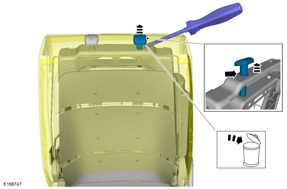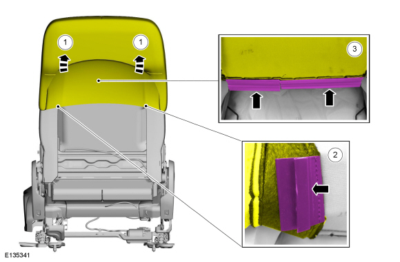 NOTE: To allow the head restraint guide sleeve to slide freely through the backrest foam pad and backrest trim cover, twist the head restraint guide sleeve to align the keyway tabs while pushing it into the backrest frame hole as far as it will go with hand pressure