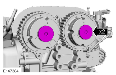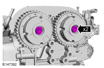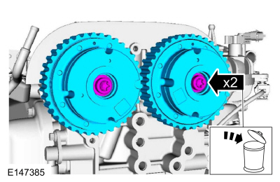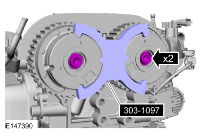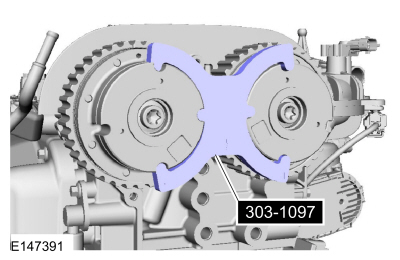 Install Special Service Tool : 303-1097 Locking Tool, Variable Camshaft Timing Oil Control UnitNOTE: Use an open-ended wrench to hold the camshafts by the hexagon to prevent the camshafts from turning.