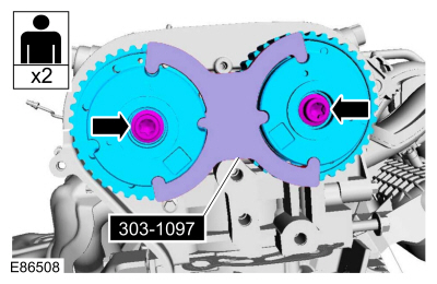 Install Special Service Tool : 303-1097 Locking Tool, Variable Camshaft Timing Oil Control UnitNOTE: Use an open-ended wrench to hold the camshafts by the hexagon to prevent the camshafts from turning.